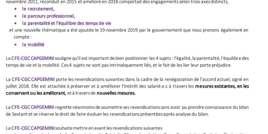Cher.e.s collègues abonné. e.s, Au terme de cet été particulier, les négociations portant sur l’égalité professionnelle entre les femmes et les hommes, la parentalité et l’équilibre des temps au sein de l’UES Capgemini, reprennent. Vous trouverez ci-dessous les rectifications portées par la CFE-CGC : Comme à l’accoutumée, vos retours/remarques/réactions sont les bienvenus afin que…