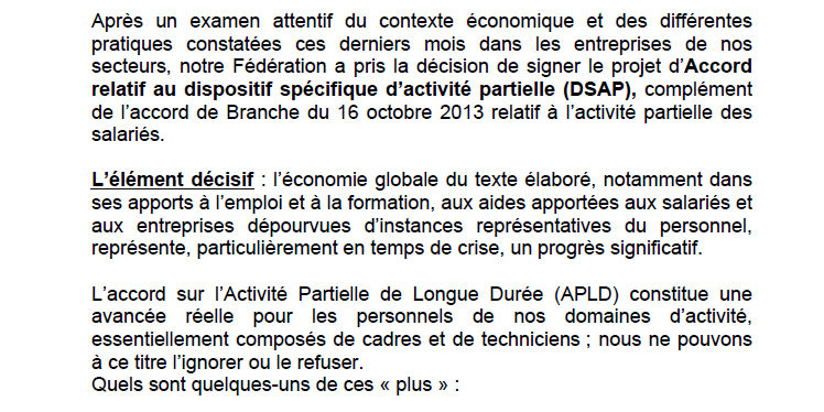 Après un examen attentif du contexte économique et des différentes pratiques constatées ces derniers mois dans les entreprises de nos secteurs, notre Fédération a pris la décision de signer le projet d’Accord relatif au dispositif spécifique d’activité partielle (DSAP), complément de l’accord de Branche du 16 octobre 2013 relatif à l’activité partielle des salariés
