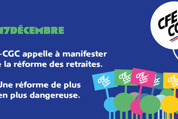 Déc122019Actualités CFE-CGC, FIECI La CFE-CGC, organisation syndicale représentative au plan national appelle les salariés visés par ses statuts à cesser le travail à l’occasion du mouvement national prévu le 17 décembre 2019. Partagez cet article !Share with FacebookShare with TwitterShare with LinkedInPost navigationPreviousPrevious post:Après MatignonNextNext post:Réforme des retraites – Appel à la mobilisation – Jeudi 05 Décembre 2019 : L’argumentaire pour tousArticles similairesFranchises, arrêts maladie ou encore retraites : 16 modifications importantes à venir sur le budget de la Sécu au Sénat18 novembre 2025Retraites : un premier pas qui en appellera d’autres25 octobre 2025Passerelles Cadres 66 – Quand le pire semble certain, pourquoi avoir peur ?16 octobre 2025Aucune réponse concrète aux attentes du monde du travail : l’intersyndicale appelle à une mobilisation massive le 2 octobre !1 octobre 2025Répondre au million de manifestant·es : l’intersyndicale lance un ultimatum1 octobre 2025La CFE-CGC a rencontré le nouveau Premier ministre1 octobre 2025