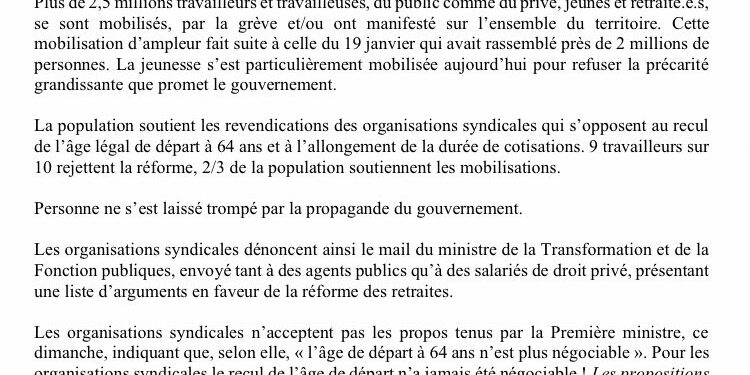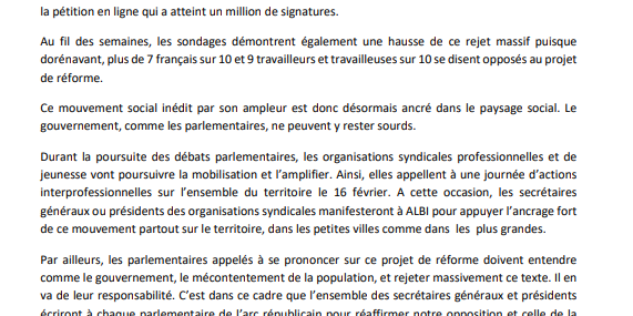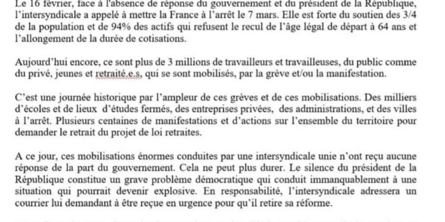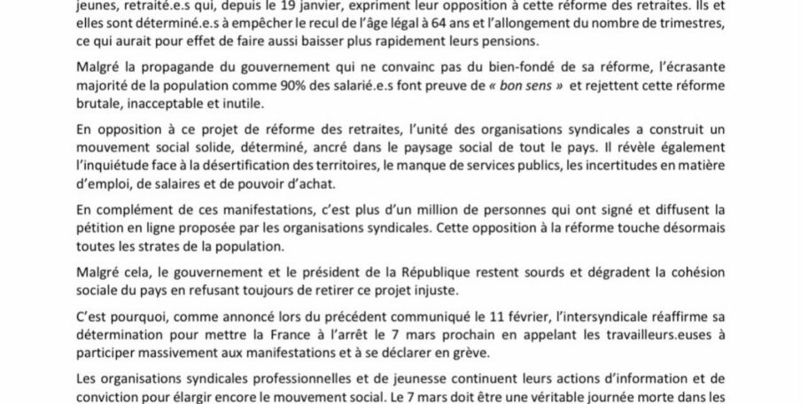 L’intersyndicale appelle à une nouvelle mobilisation interprofessionnelle ce samedi 11 mars puis dès la semaine prochaine, à une journée de manifestations et de grève, le jour de la commission mixte paritaire, moment important du calendrier parlementaire.