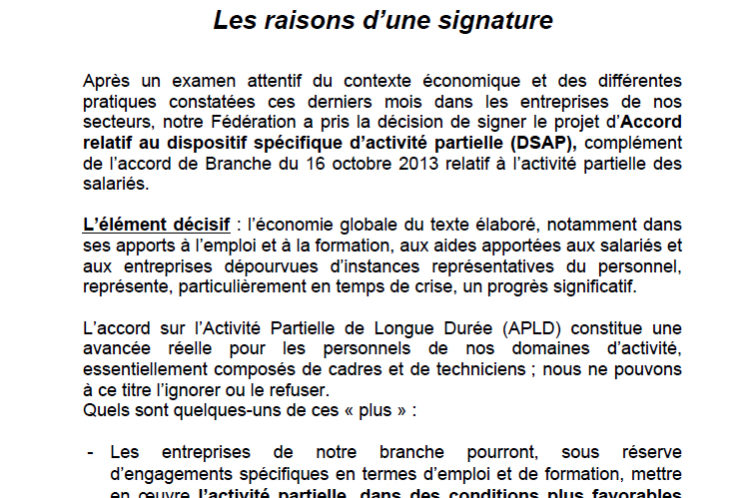 Après un examen attentif du contexte économique et des différentes pratiques constatées ces derniers mois dans les entreprises de nos secteurs, notre Fédération a pris la décision de signer le projet d’Accord relatif au dispositif spécifique d’activité partielle (DSAP), complément de l’accord de Branche du 16 octobre 2013 relatif à l’activité partielle des salariés