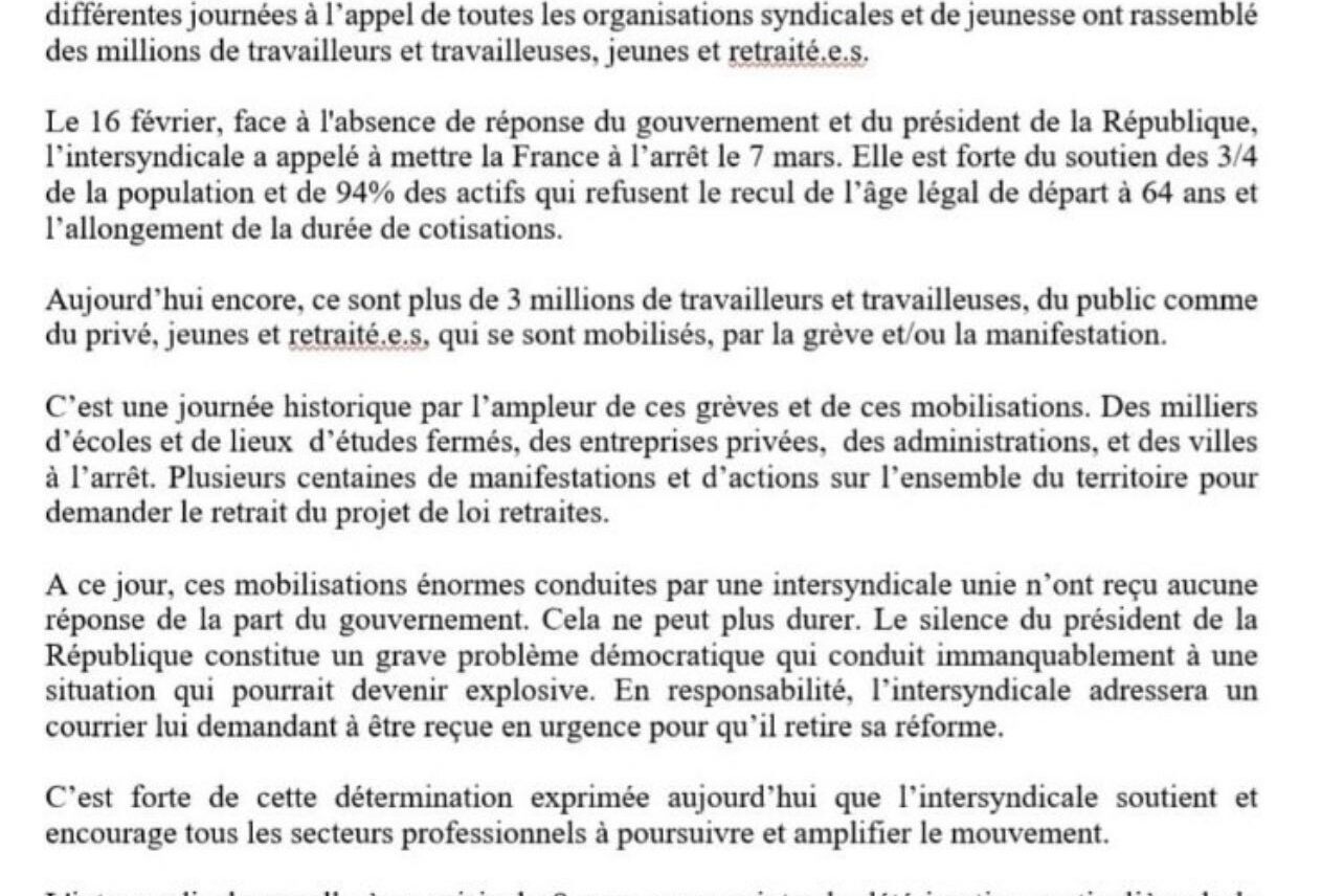 L’intersyndicale appelle à une nouvelle mobilisation interprofessionnelle ce samedi 11 mars puis dès la semaine prochaine, à une journée de manifestations et de grève, le jour de la commission mixte paritaire, moment important du calendrier parlementaire.