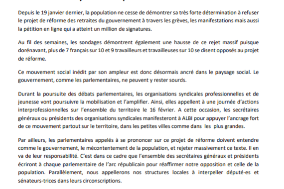 Fév152023Actualités CFE-CGC, FIECI Si gouvernement et parlementaires restaient sourds, l’intersyndicale appellerait à durcir le mouvement en mettant la France à l’arrêt le 7 mars. Partagez cet article !Share with FacebookShare with TwitterShare with LinkedInPost navigationPreviousPrevious post:Communiqué intersyndical : nous exigeons le retrait du projet de réforme des retraites qui pénalise particulièrement les femmesNextNext post:Le gouvernement et les parlementaires ne peuvent pas être sourds à cette mobilisation puissanteArticles similairesFranchises, arrêts maladie ou encore retraites : 16 modifications importantes à venir sur le budget de la Sécu au Sénat18 novembre 2025Retraites : un premier pas qui en appellera d’autres25 octobre 2025Passerelles Cadres 66 – Quand le pire semble certain, pourquoi avoir peur ?16 octobre 2025Aucune réponse concrète aux attentes du monde du travail : l’intersyndicale appelle à une mobilisation massive le 2 octobre !1 octobre 2025Répondre au million de manifestant·es : l’intersyndicale lance un ultimatum1 octobre 2025La CFE-CGC a rencontré le nouveau Premier ministre1 octobre 2025