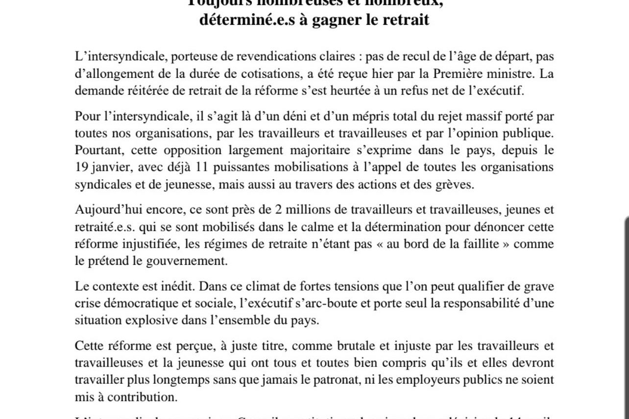 Avr142023Actualités CFE-CGC, FIECI L’intersyndicale appelle à une journée de mobilisations et de grève le 13 avril et soutient toutes les actions et initiatives intersyndicales de mobilisations, y compris le 14 avril, pour gagner le retrait de cette réforme. Partagez cet article !Share with FacebookShare with TwitterShare with LinkedInPost navigationPreviousPrevious post:Passerelles Cadres 56 – La magie de l’OracleNextNext post:Réforme des retraites – déclaration intersyndicaleArticles similairesFranchises, arrêts maladie ou encore retraites : 16 modifications importantes à venir sur le budget de la Sécu au Sénat18 novembre 2025Retraites : un premier pas qui en appellera d’autres25 octobre 2025Passerelles Cadres 66 – Quand le pire semble certain, pourquoi avoir peur ?16 octobre 2025Aucune réponse concrète aux attentes du monde du travail : l’intersyndicale appelle à une mobilisation massive le 2 octobre !1 octobre 2025Répondre au million de manifestant·es : l’intersyndicale lance un ultimatum1 octobre 2025La CFE-CGC a rencontré le nouveau Premier ministre1 octobre 2025